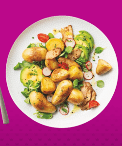Een frisse en kleurrijke aardappelsalade met avocado, radijs en veldsla – klaar in 20 minuten en perfect voor een lichte, gezonde maaltijd. 🥗