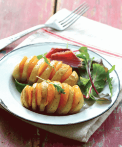 Hasselback aardappelen met abrikoos en Ibérico ham