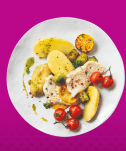 Deze kabeljauw met aardappelen, spruitjes en kerstomaten is een fris en kleurrijk gerecht, glutenvrij en lactosevrij, dat je in een halfuur op tafel zet.
