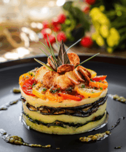 Een kleurrijke en hartige vegetarische parmentier met laagjes puree van Princesse Amandine-aardappelen, courgette, aubergine en tomaat — afgewerkt met chips en pesto.