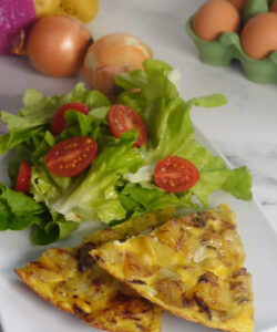 Een klassieke Spaanse tortilla met blokjes Princesse Amandine-aardappel, ui en eieren — langzaam gebakken tot goudbruin aan beide zijden.