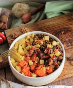 Un bowl automnal gĂ©nĂ©reux mĂȘlant pommes de terre rĂŽties Princesse Amandine, courge, lentilles, marrons, figues et comtĂ© fondant â une ode aux saveurs de saison.