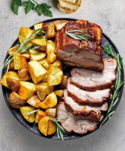 Un mijoté d’hiver réconfortant où un rôti de porc est doucement braisé avec des pommes de terre sautées à l’ail et parfumé de romarin.