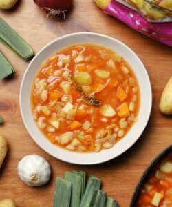 Un minestrone colorĂ© et rĂ©confortant mĂȘlant pommes de terre, carottes, poireaux, tomates et haricots blancs pour une soupe riche en saveurs et en douceur.