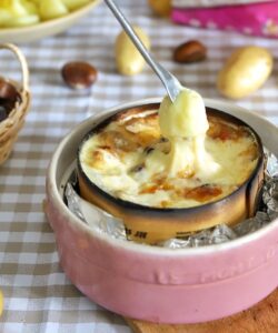 - Sortez le Mont d’Or du four et retirez le papier d’aluminium. Disposez les pommes de terre, autour du Mont d’Or fondu pour tremper avec des piques à fondue.