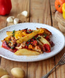 Un plat complet rĂŽti au four mĂȘlant pommes de terre Princesse Amandine, morceaux de poulet, lĂ©gumes et mozzarella gratinĂ©e pour un repas savoureux et convivial.